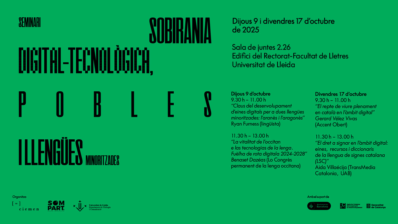L'Universitat de Lhèida organiza un seminari Sobeiranetat numerica-tecnologica, pòbles e lengas minorizadas, sus dos jorns al mes d'octobre de 2025.